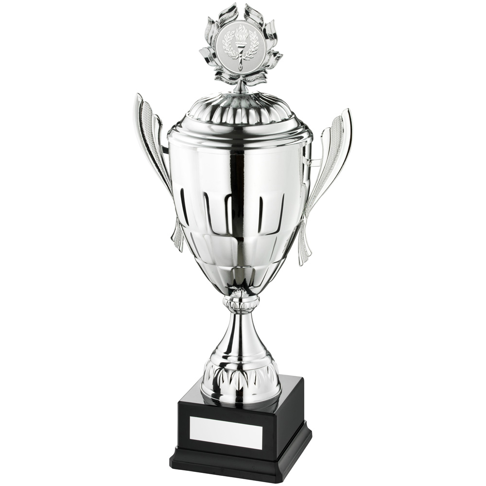 LARGE SILVER CONICAL BOWL WITH HANDLES AND LID TROPHY