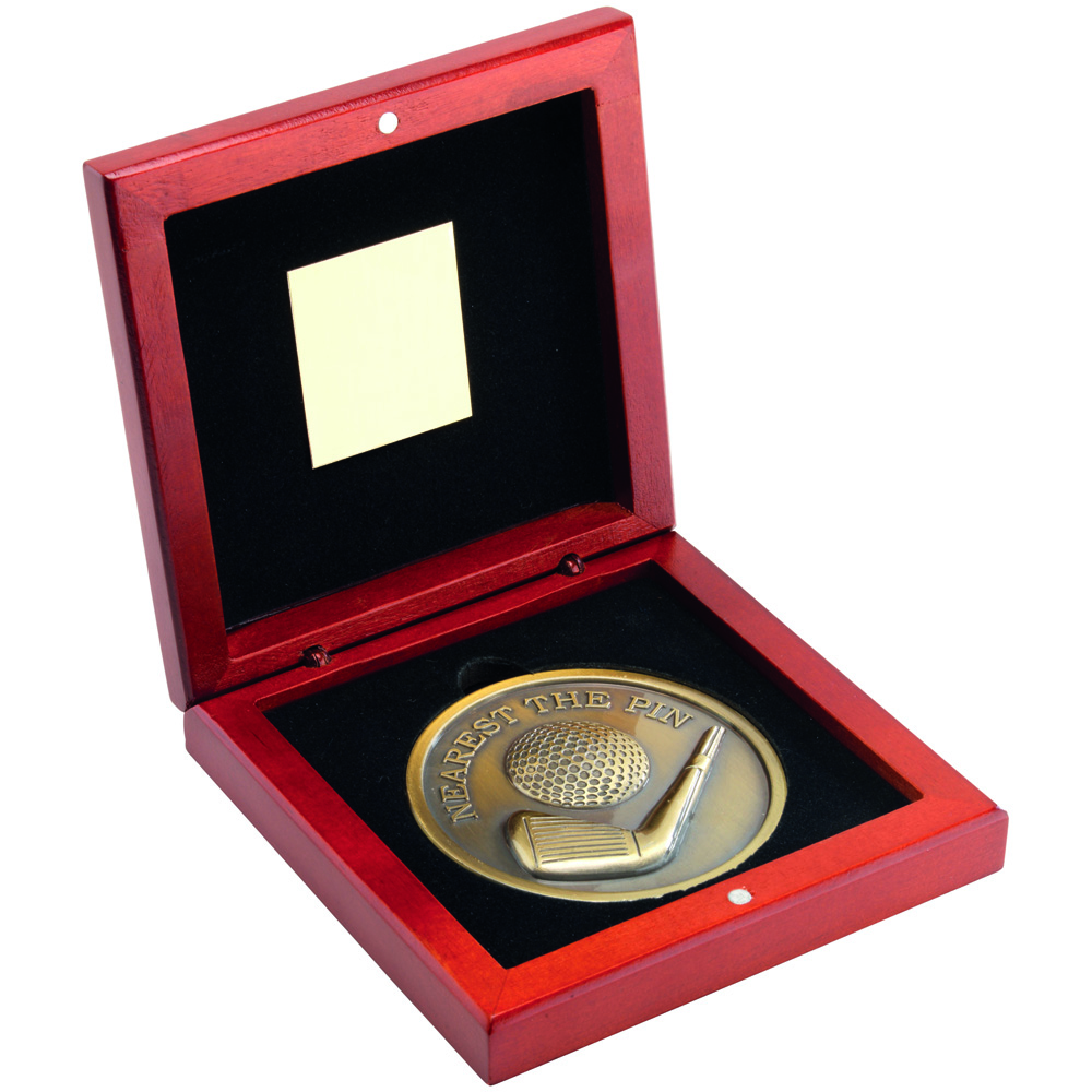 ROSEWOOD BOX AND 70mm MEDALLION GOLF TROPHY